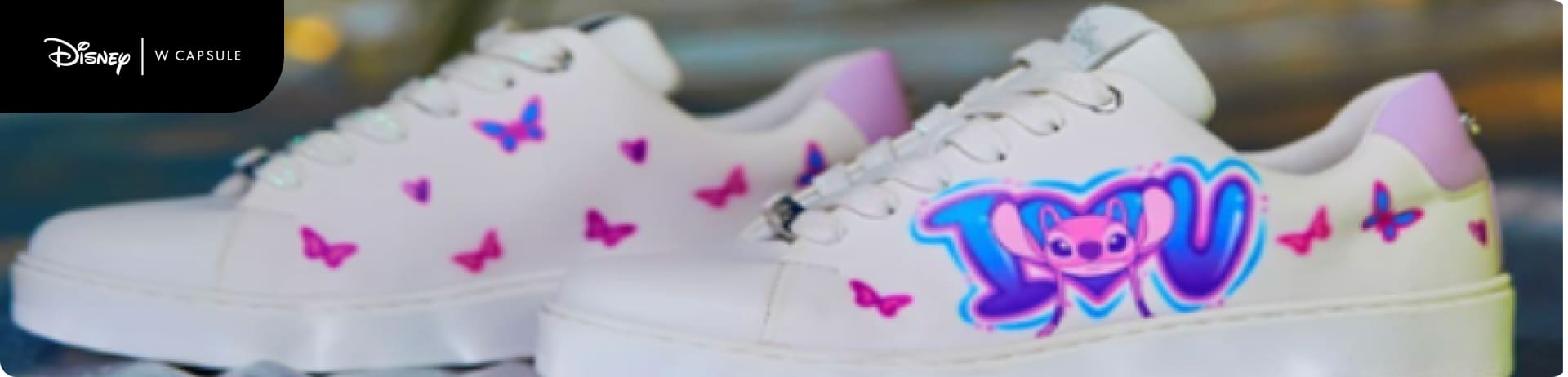 “La nueva colección de W Capsule incluye sandalias, tenis, cosmetiqueras y mochilas, todos decorados con las encantadoras imágenes de Stitch de Disney.